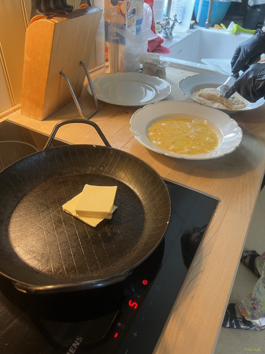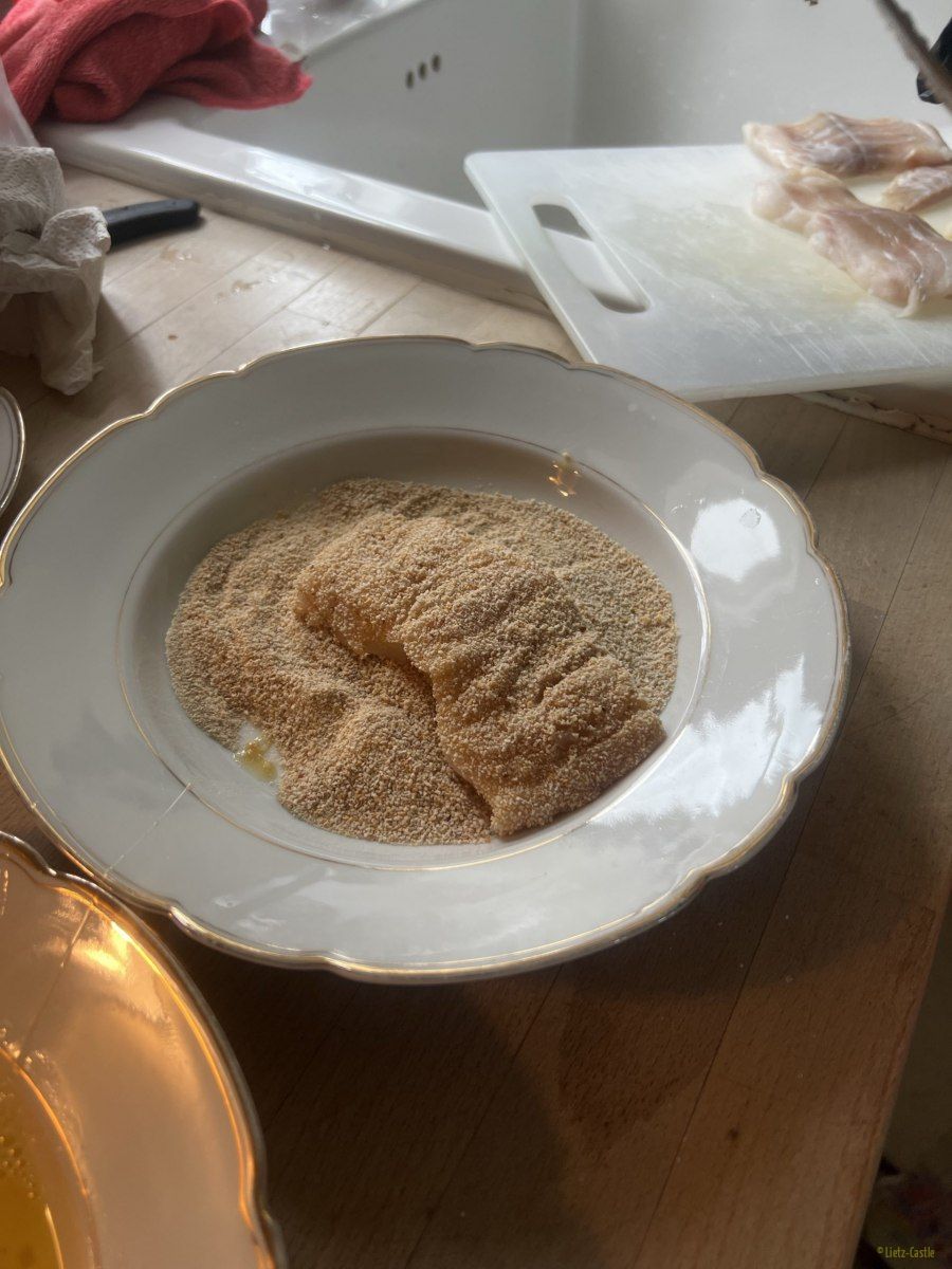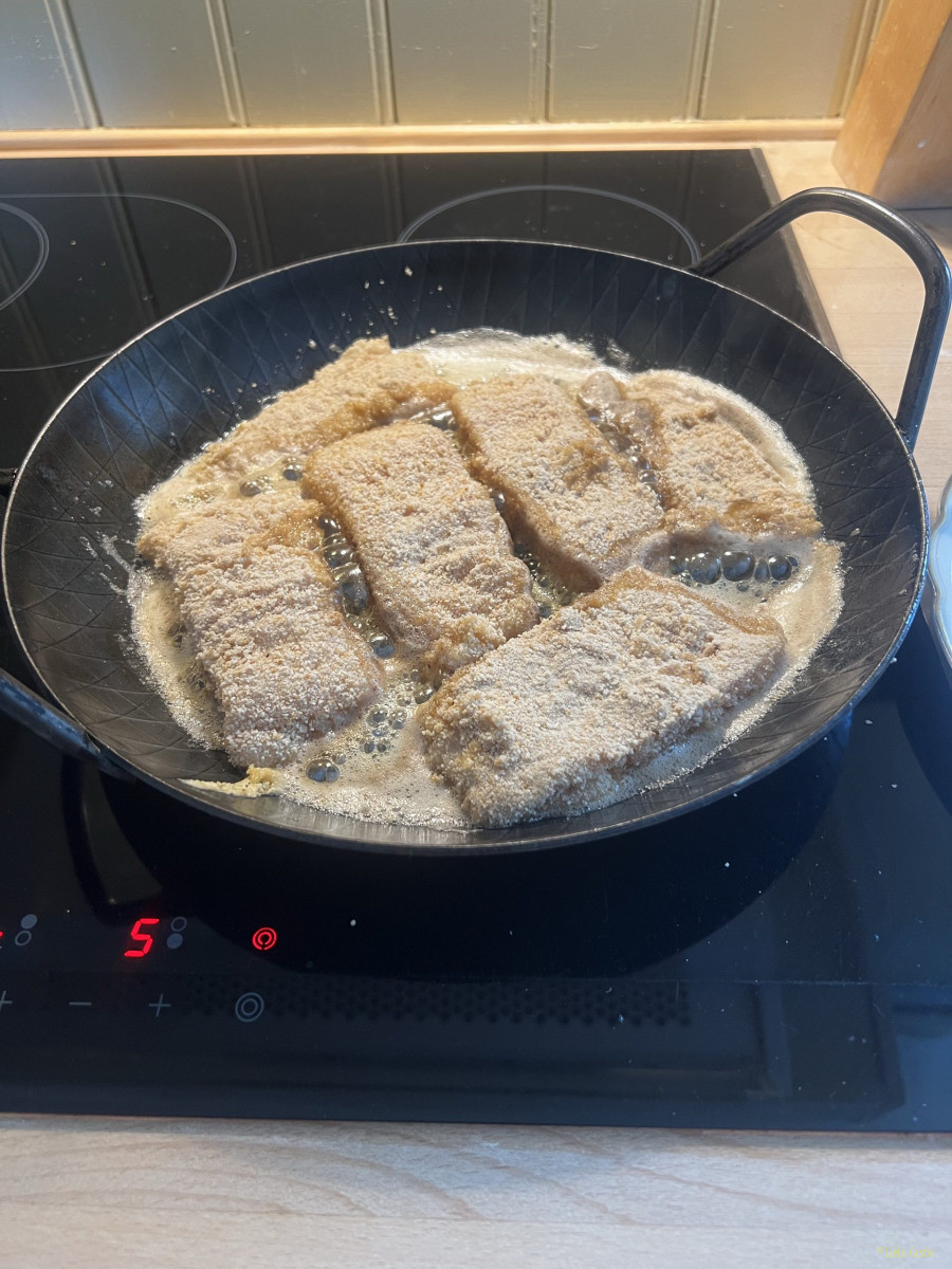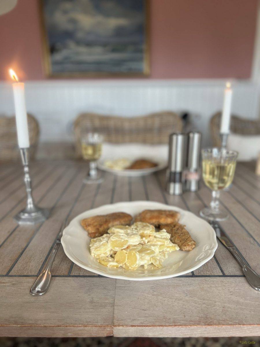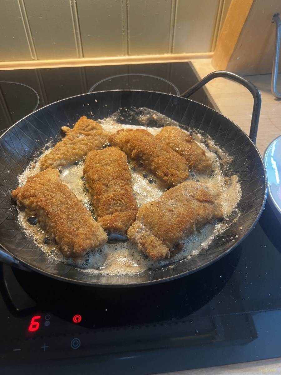 Fangfrische Fischstäbchen, geschnitzt aus dem Fisch den wir heute morgen gekauft hatten, dazu gab es Flødekartofler, wir sagen dazu Kartoffelgratin.